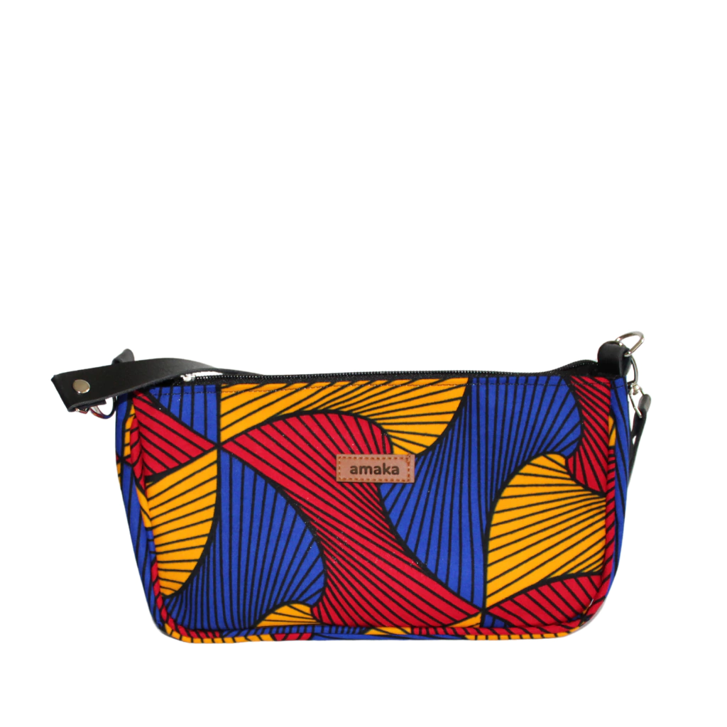 Bolsa baguete estruturada e confeccionada em tecido africano 100% algodão, com forro impermeável, fechamento em zíper e com alça em couro ecológico com regulagem no tamanho máximo de 1,40 m.
